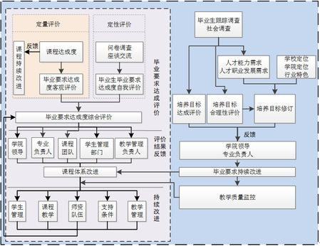 改进模式包括校内(校内的教学过程质量监控)、校外(毕业生及用人单位反馈)两个循环:校内循环主要是对车辆工程专业课程体系的改进,通过适时定性和定量评价毕业要求的达成度,从而不断改进课程体系和课程目标,以实现对毕业要求达成的持续改进。校外循环主要是对车辆工程专业培养目标和毕业要求的改进,通过适时评价培养目标的合理性,调整培养目标以实现培养目标适应社会发展和行业需求。通过评价培养目标的达成情况,调整改进毕业要求,以实现对培养目标达成的改进。公司应建立人才培养目标的合理性评价机制、毕业要求达成度评价机制、课程体系合理性评价机制及课程目标达成度评价机制,进一步规范教学过程评价与持续改进的实施。