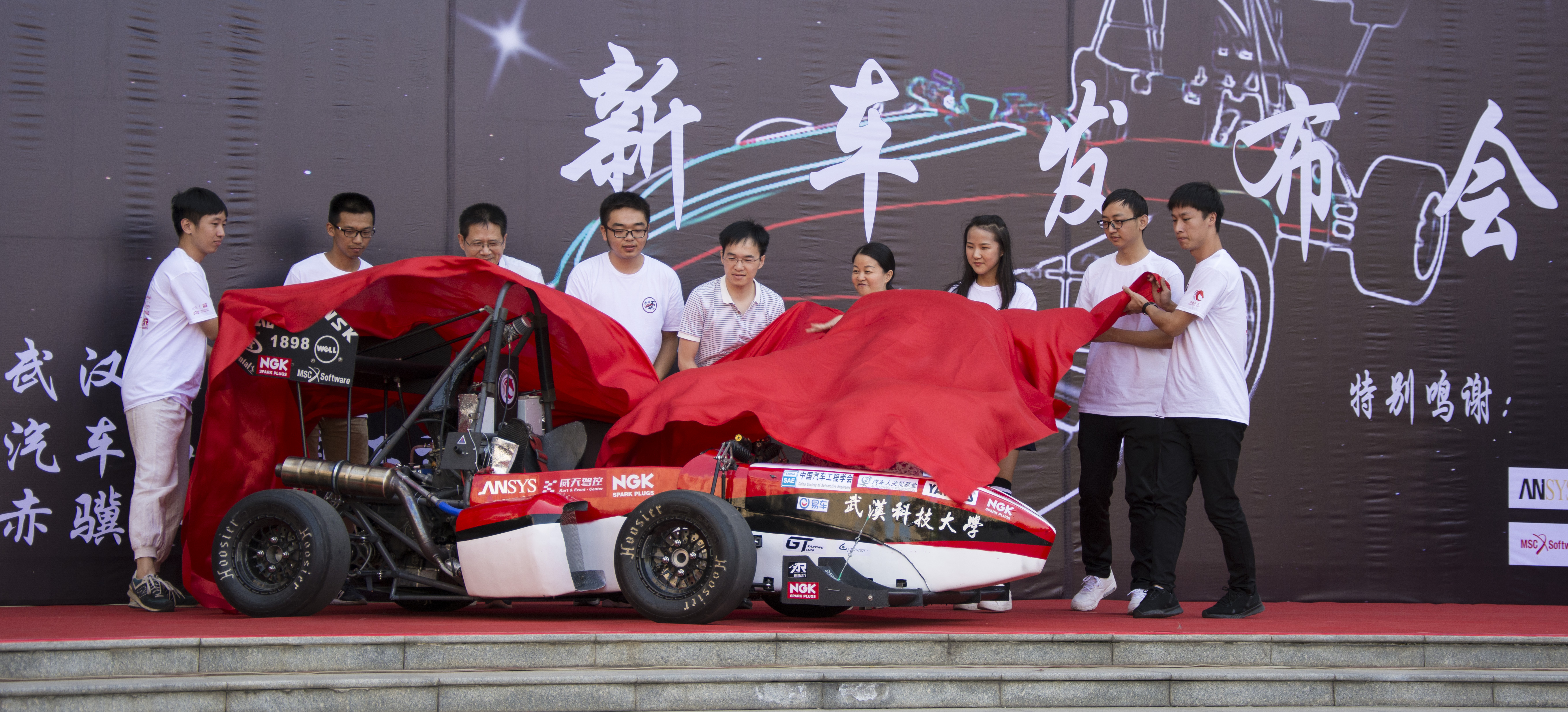 面对同学们对赤骥五代的好奇,赤骥车队队长曾翔上台发言,在向大家介绍了车队的辉煌历史后,他结合ANSYS分析视频,从底盘、动力、优化等方面由浅入深地介绍了赤骥五代身上具备的技术优势。随后,张会利、应保胜、龚边以及曾翔四人携手揭开了覆盖在赤骥五代车身上的红毯,宣告了赤骥小五的正式亮相。