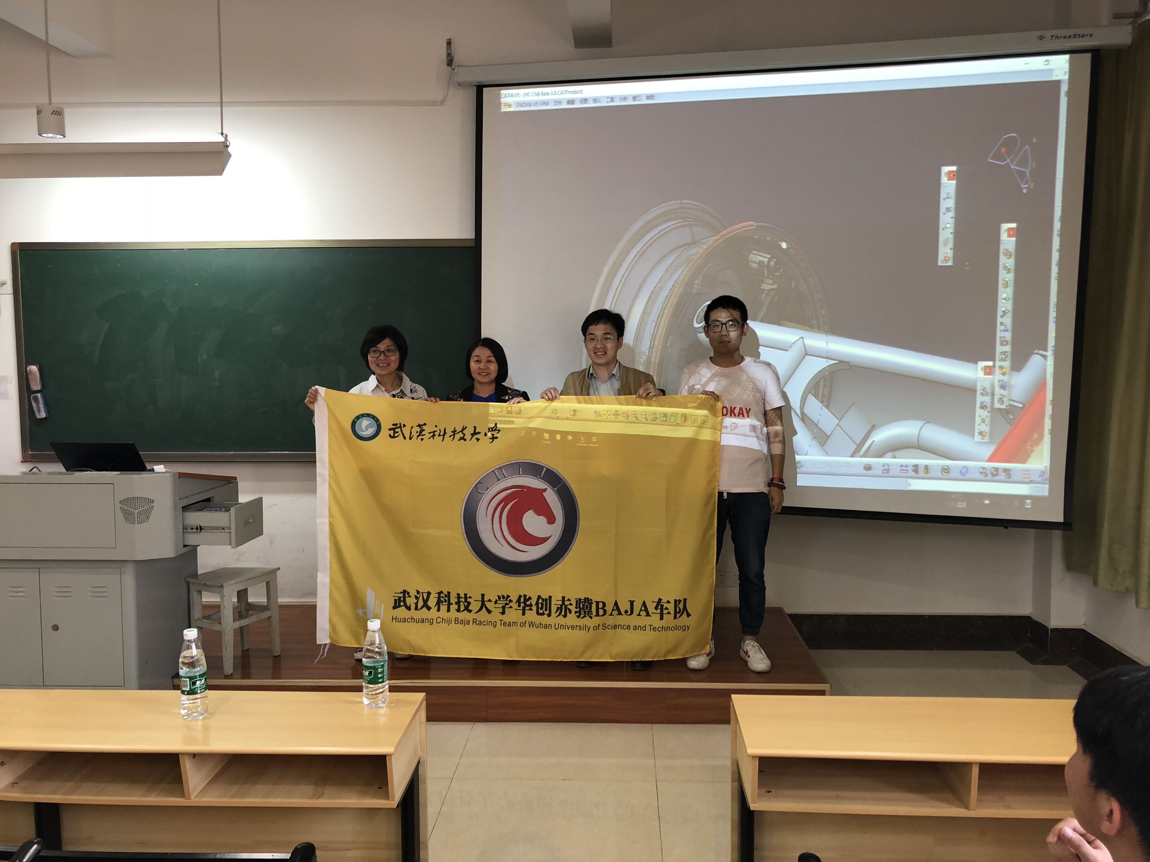 总装大会开始,BAJA车队队长李浩东首先对车队近期的工作进展情况做出汇报。随后,车身、悬架、制动等7个技术组的负责人依次上台,现场结合屏幕上展示的CATIA总装模型进行介绍。在各组汇报总结过程中,指导老师龚边一直与各组负责人交流各种技术问题,并结合自己大学期间从事车队工作的经验提出疑问与建议。