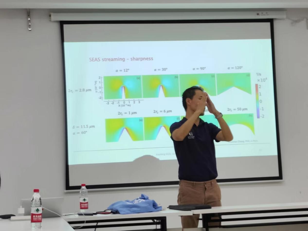 郭孝峰教授通过项目讲解和案例分享,介绍了巴黎西岱大学部分跨学科交叉课题的研究进展,包括干燥地区空气取水技术、路基通电融雪涂层、建筑光感变色/变形材料、人类社会拟鱼化研究、马匹运动能力与呼吸进食的关系、人类长跑运动的节能方式、检测空气特性的植物传感器、声流传导、尖角摆动游泳机器人以及板上液滴运动与振动频率及液滴大小的关系等。