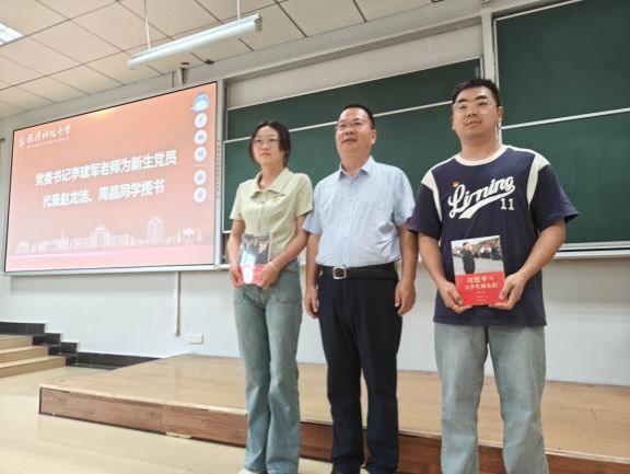 典礼在庄严的国歌声中拉开序幕,李建军为2024级研究生党员代表赵龙浩、周晶授书,鼓励员工党员在未来的学习中,发扬先锋模范作用,秉持不怕苦、爱钻研的精神。