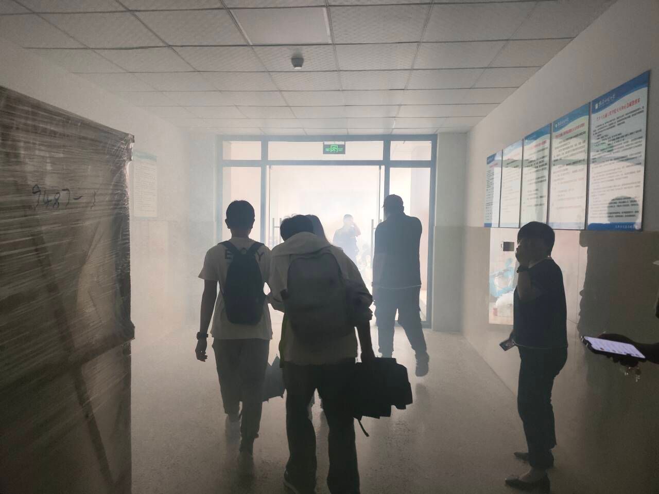 随着消防灯光报警响起,演练正式拉开帷幕。教九楼内,师生们迅速反应,选择楼梯有序疏散。面对模拟烟雾,大家沉着冷静,弯腰捂鼻,无一人出现慌乱或拥挤。整个疏散过程紧张有序,充分展现了师生们良好的安全素养与应急反应能力。保卫处和公司领导全程维持秩序,不断提醒师生注意安全,严防踩踏事件发生。最终,全体师生在规定时间内安全疏散至指定区域。
